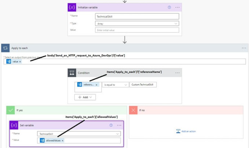 - Add action "Apply to each" with an output of "Send an HTTP request to Azure DevOps" This will return all Azure DevOps work item fields